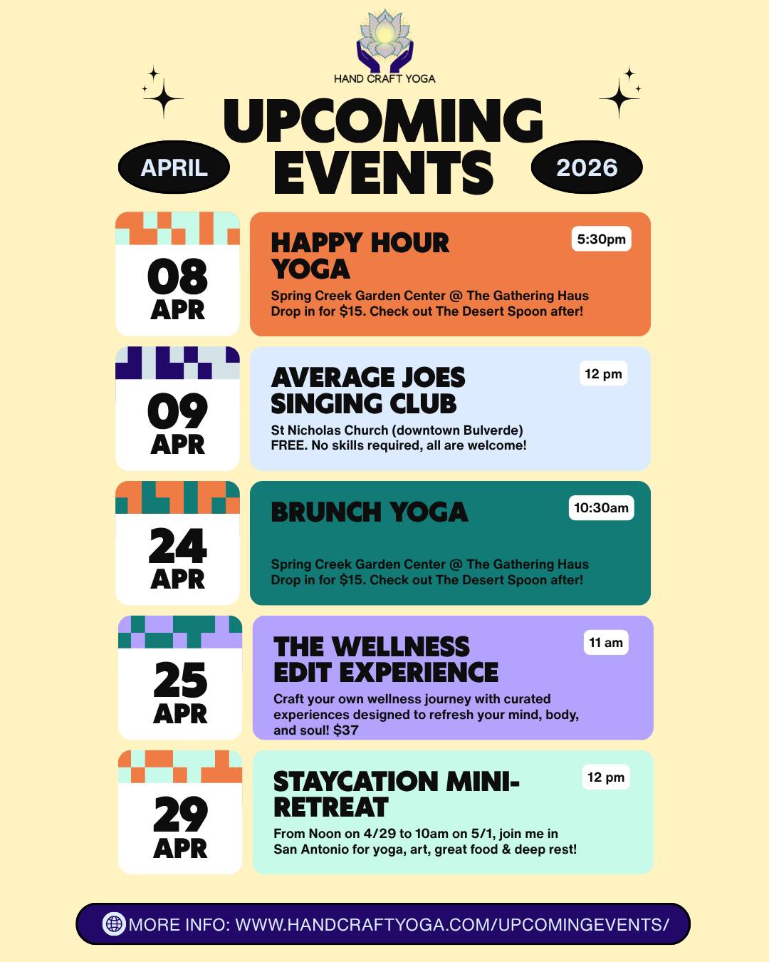 Two chances to practice 4/8 In addition to our regularly scheduled Wednesday Noon class (at Trilogy Hill Country), we are back for happy hour yoga this week at Spring Creek Garden Center from 5:30 to 6:30 pm! And the best part: I just got word that The Desert Spoon rolled out a brand new spring menu 👀 So if you need a little midweek reset... this is your sign. Move your body, take a breath, and then stay after for a drink or a bite and check out what’s new. Happy hour specials run until 7....